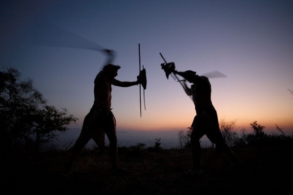 These are a young men who are playing a game whereby two indivuals hold a stick in one hand while in another the hold another stick and then they wrap one hand with a blanket as to block an attacks from their opponant. These two people then fight using the sticks until one has won.